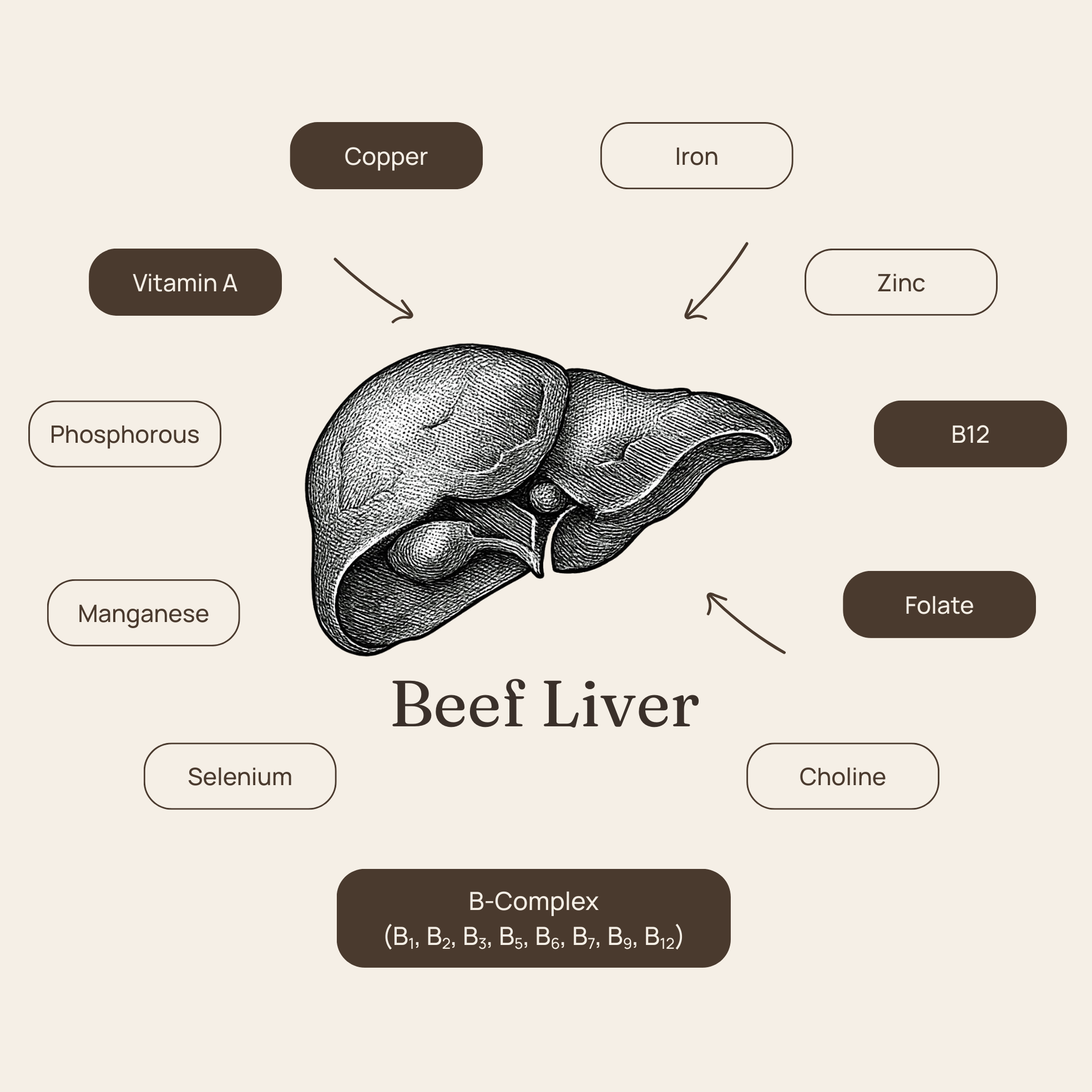 Beef liver naturally contains vitamin B12, folate, vitamin A, iron and copper — nutrients the body typically uses in combination, not in isolation.